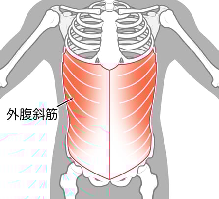 腹斜筋とは、お腹の横、いわゆる脇腹部分にある筋肉を指します。表層部にあるものを「外腹斜筋」、その内側にあるものを「内腹斜筋」と呼びます。腹斜筋は、体幹のなかでも特に「ひねる」動作と「体幹の固定」に関わる筋肉です。また、腹斜筋を鍛えることはお腹のくびれにも効果的ですので、男女ともに引き締まったお腹を目指したい人は必ず鍛えてほしい筋肉です。