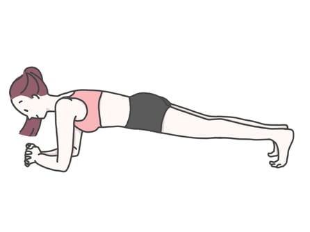 腹部を床から離し、足・膝・股・肩、全ての関節と頭が一直線になるようにします。上半身をしっかりとアイソメトリック(等尺性)に保ち、肘を肩の真下に、頭をニュートラルな姿勢で維持してください。通常は10秒から2分程度が理想だと言われています。